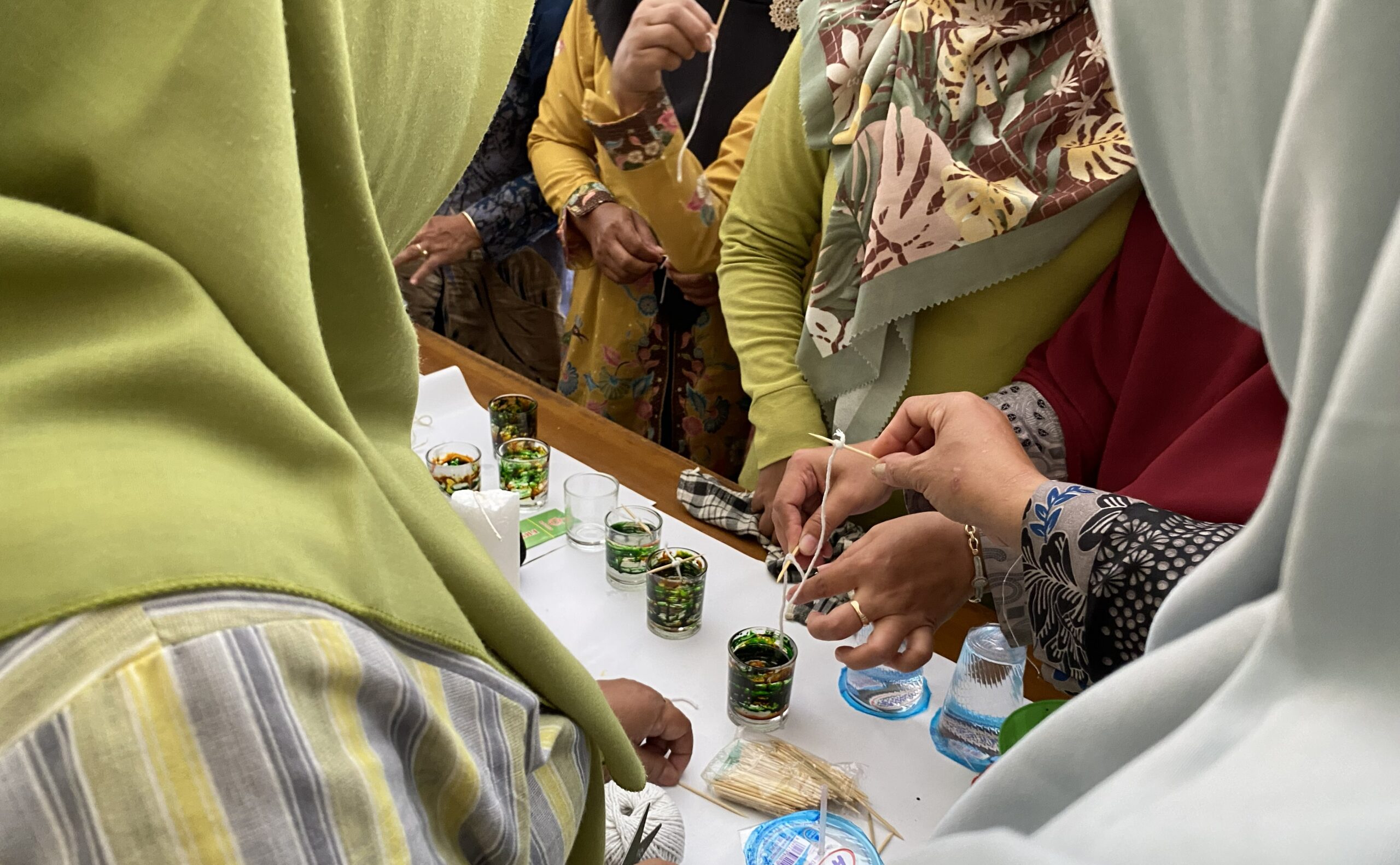 Ibu-ibu PKK tampak antusias mengikuti setiap tahapan yang diperagakan dan aktif mengajukan pertanyaan seputar teknik pembuatan, penggunaan minyak kayu putih, bahkan peserta turut terlibat langsung dalam proses menghias gelas lilin aroma terapi.